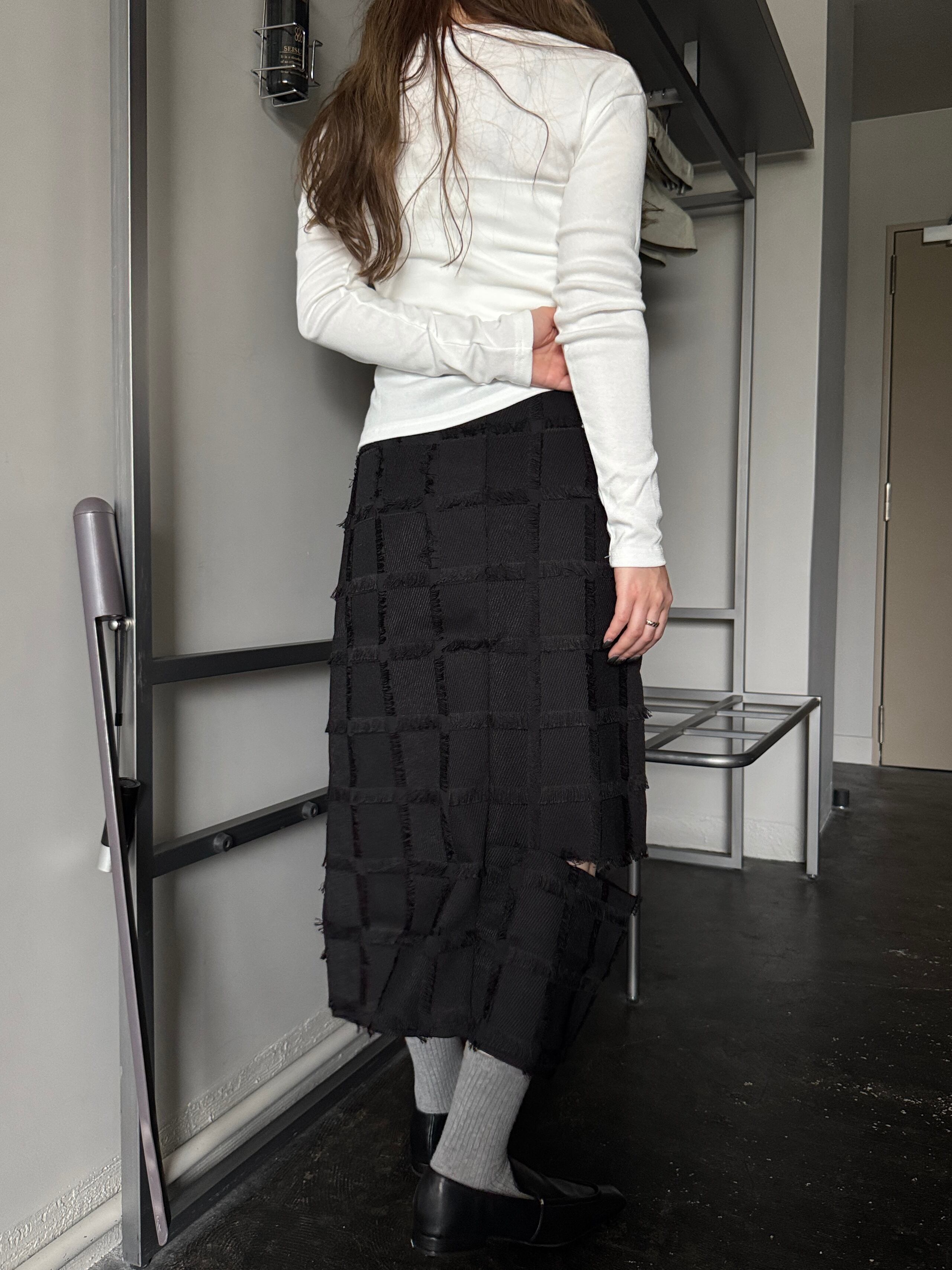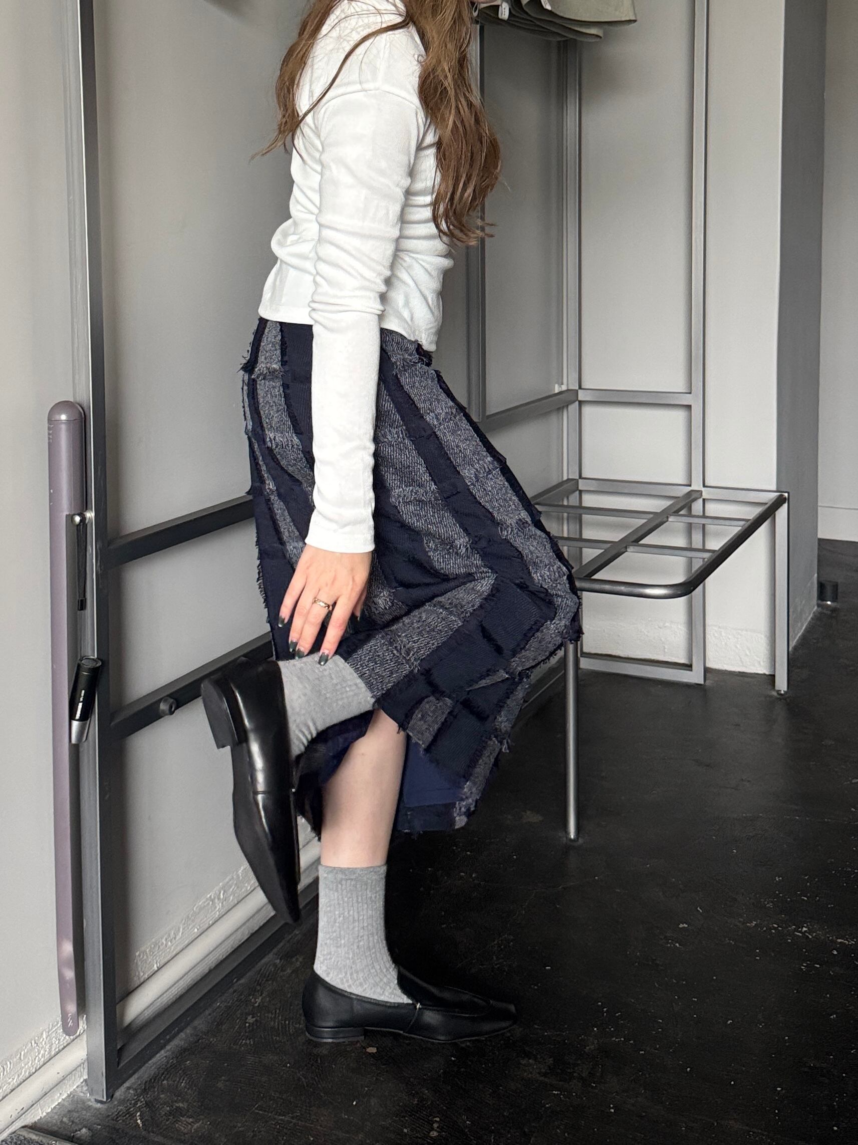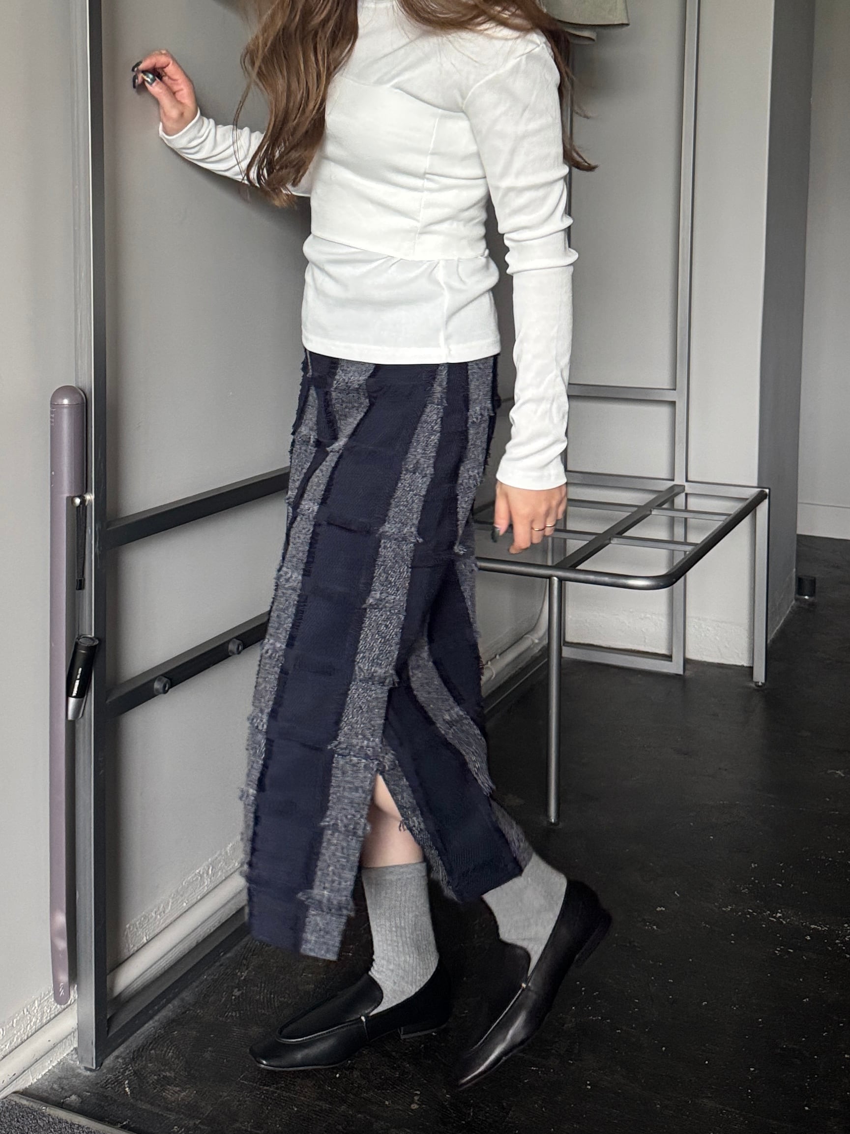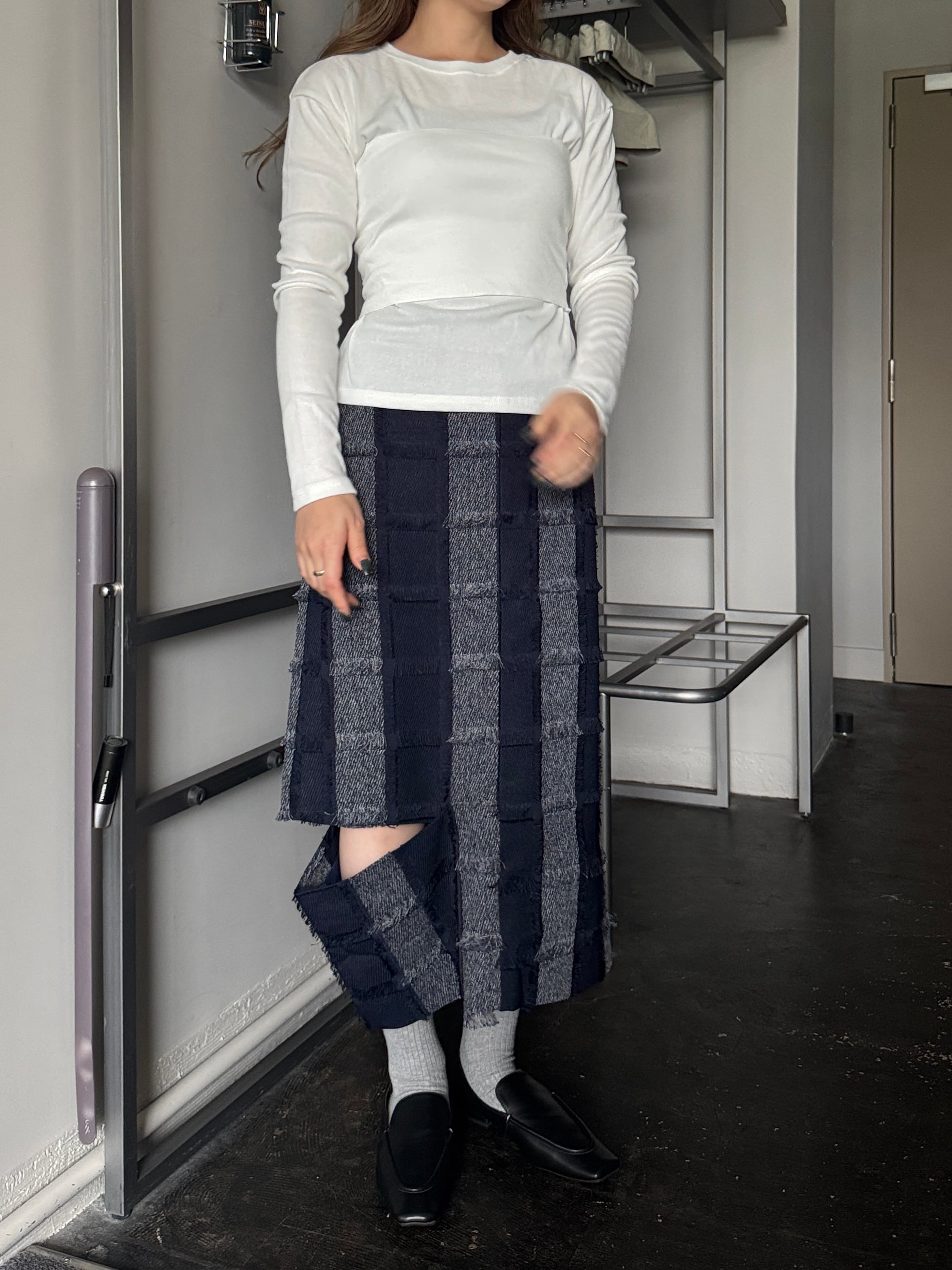スクエアフリンジとサイドカットデザインが特徴的なスカートです。