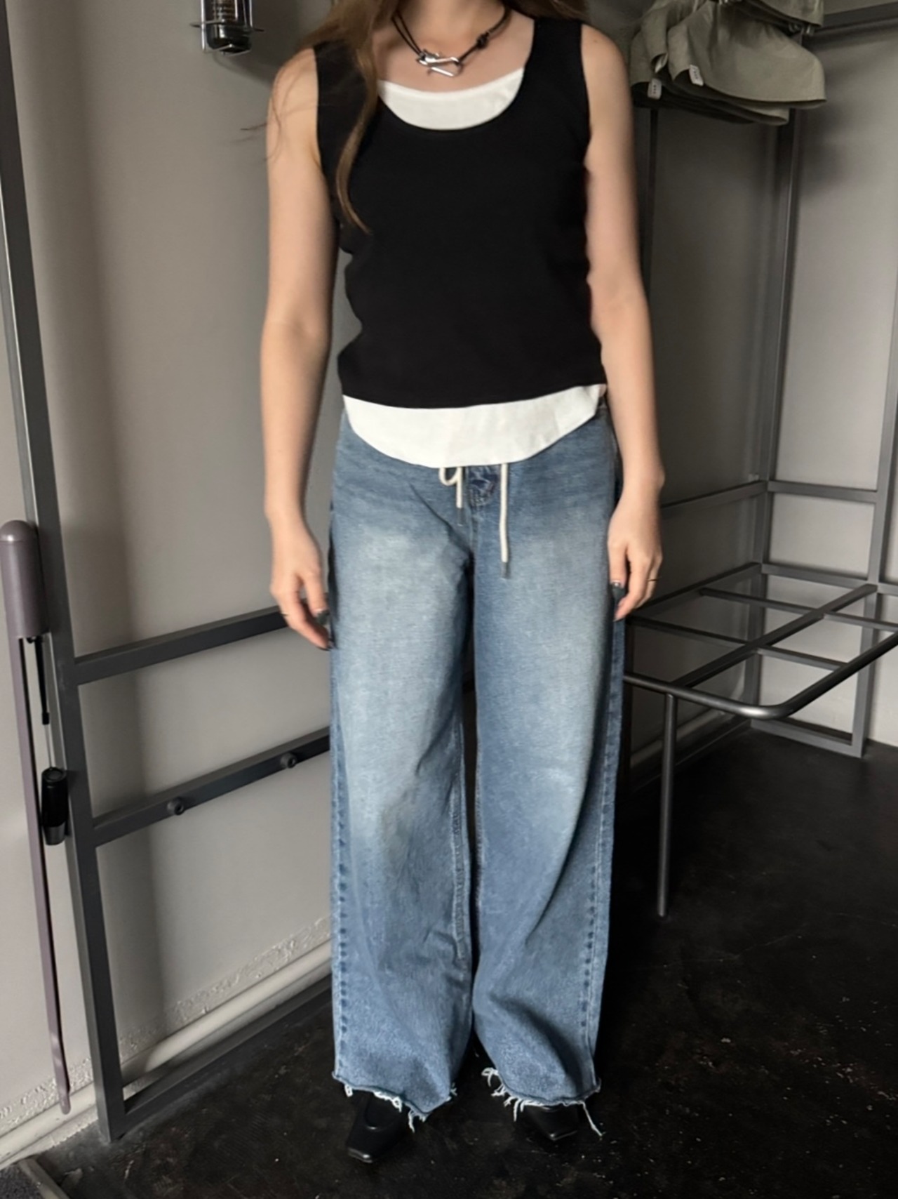 ウエストのロープが特徴的なデニムです