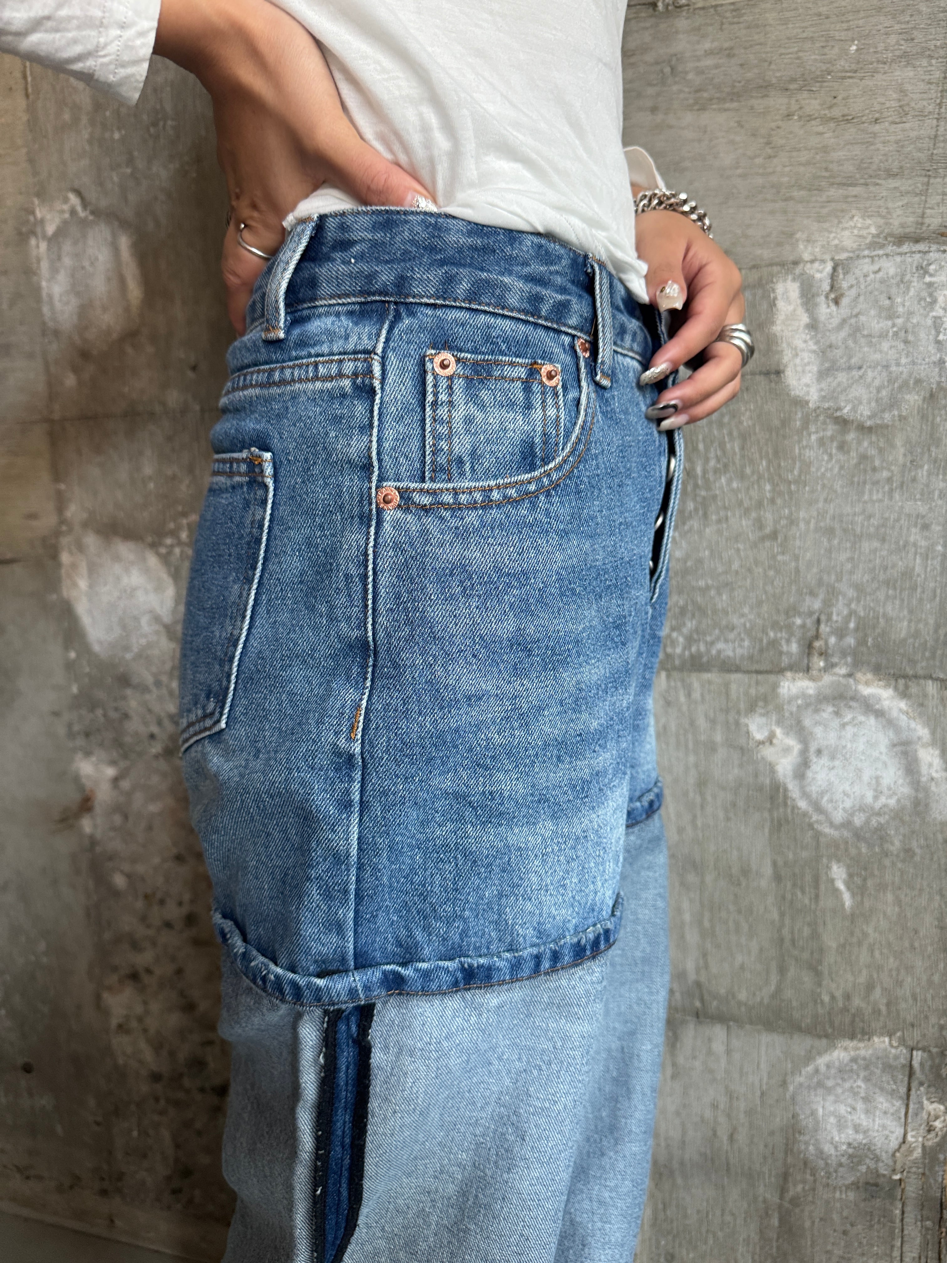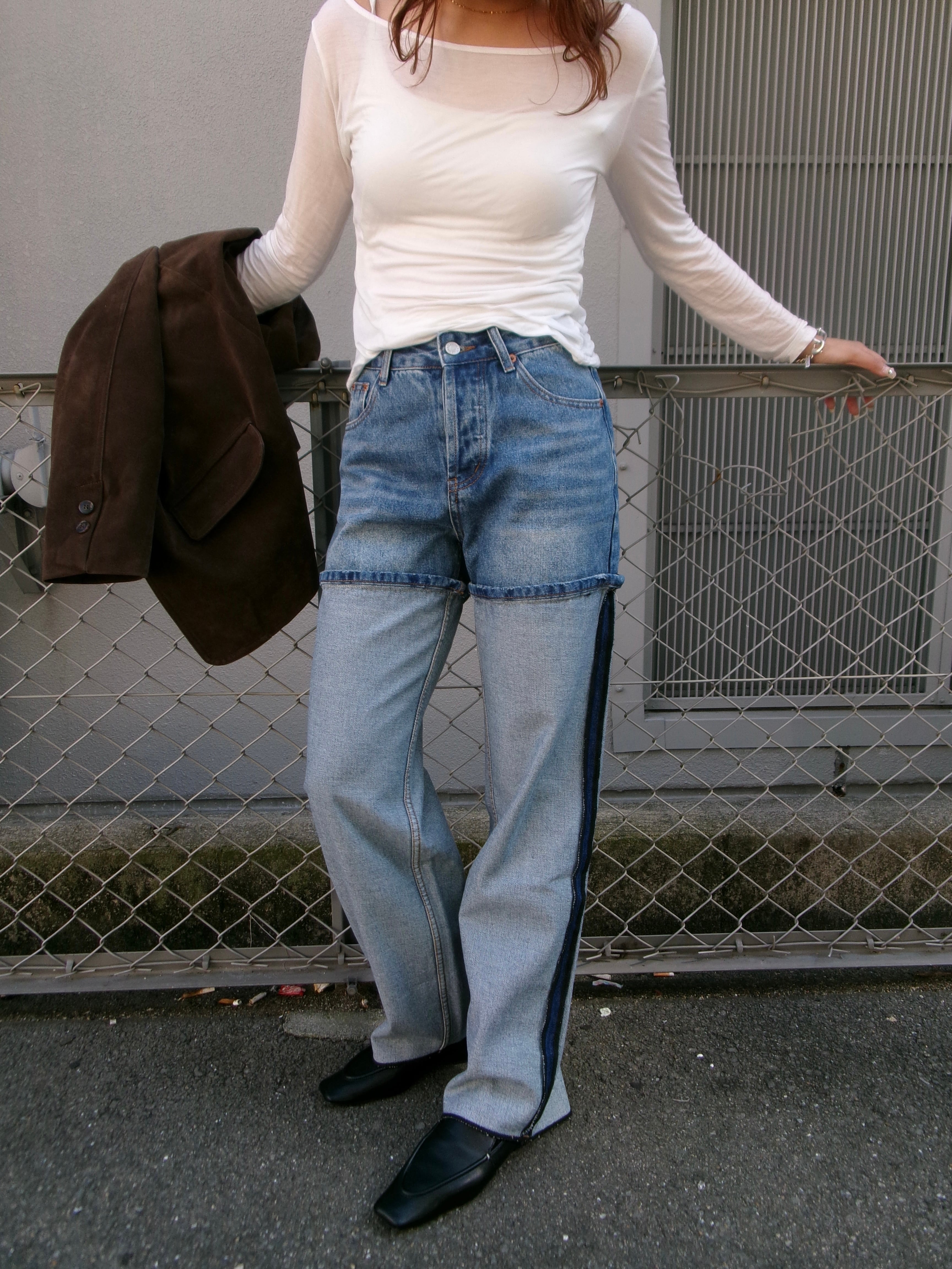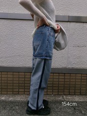 切り返しのデザインが特徴的なデニムです。