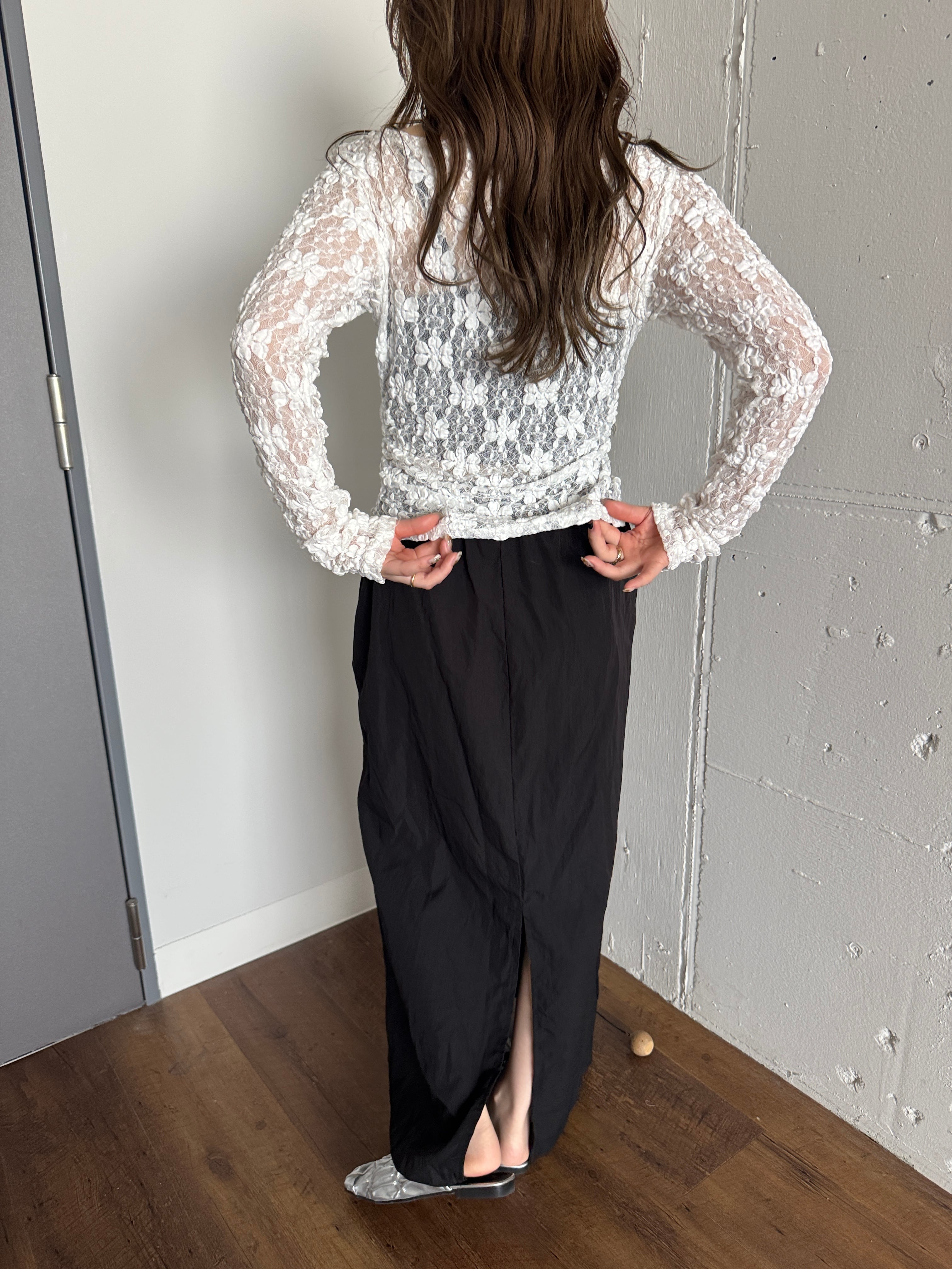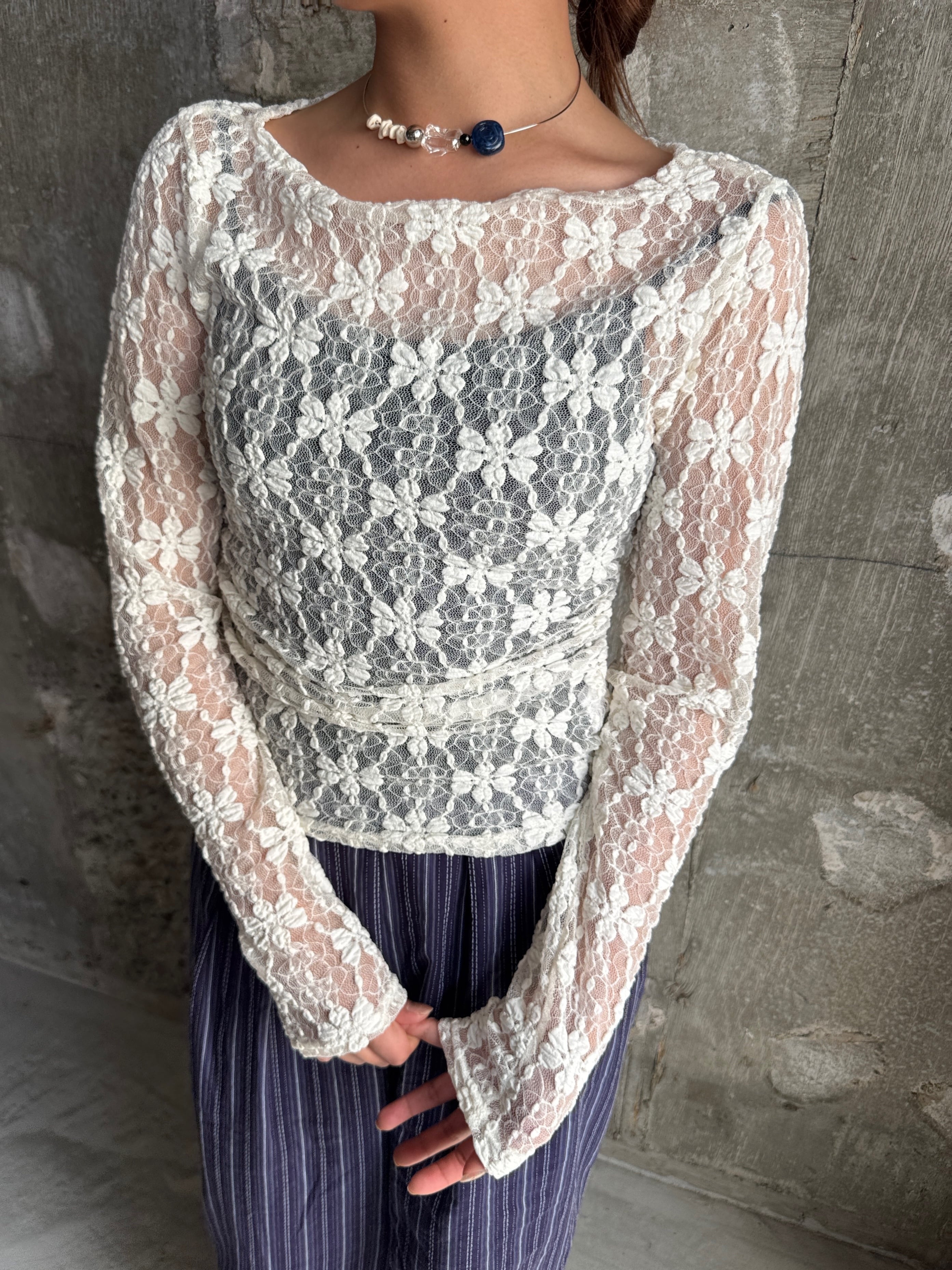 ・立体感のあるフラワーレースが華やかな印象を与えるシアートップス。