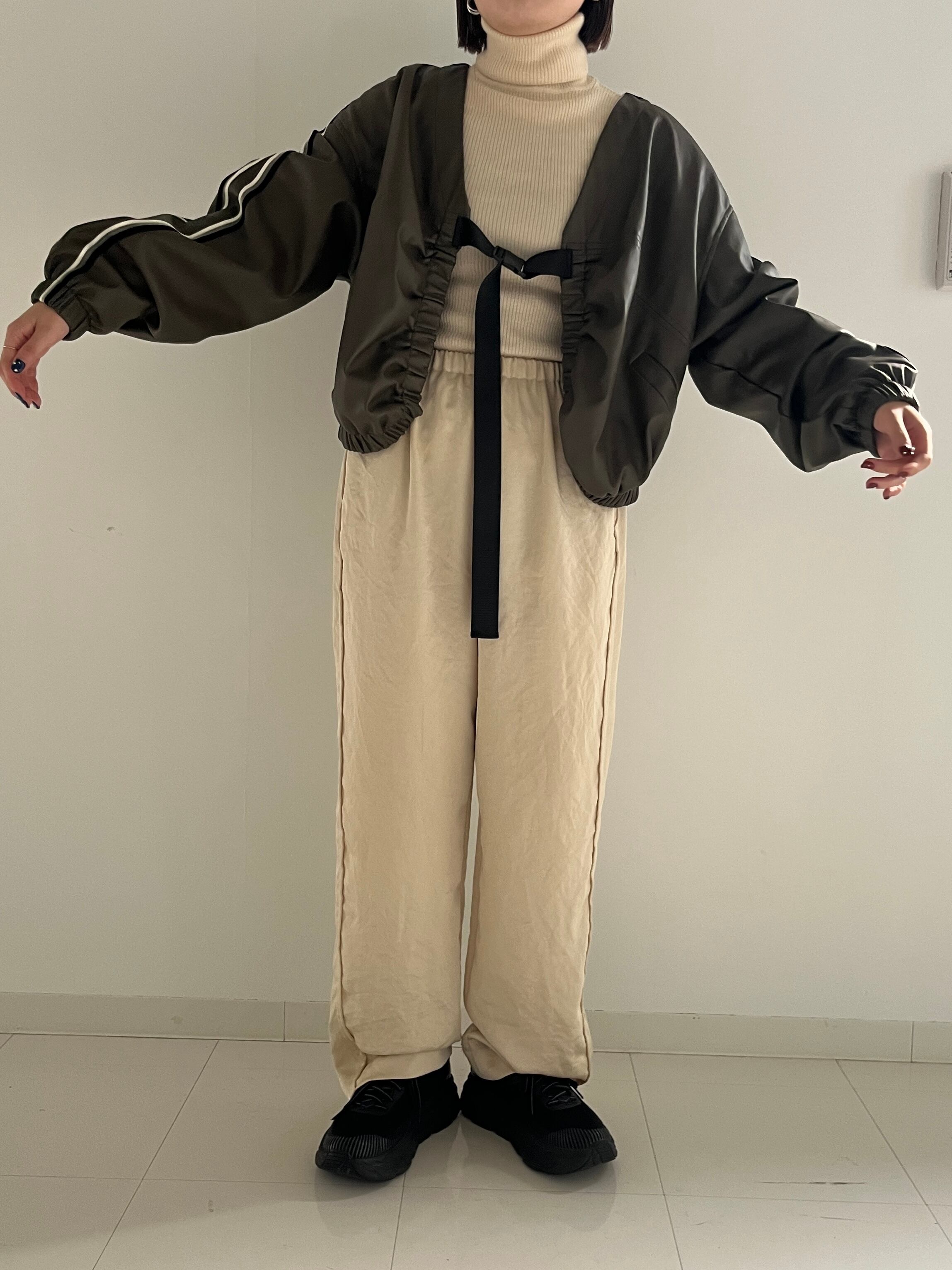 裾のギャザーやアームのラインデザインなど、こだわりを感じさせるディテールに注目。丈を短めに仕立てたコンパクトなシルエットなので、合わせるボトムを選ばず幅広く活躍してくれます。