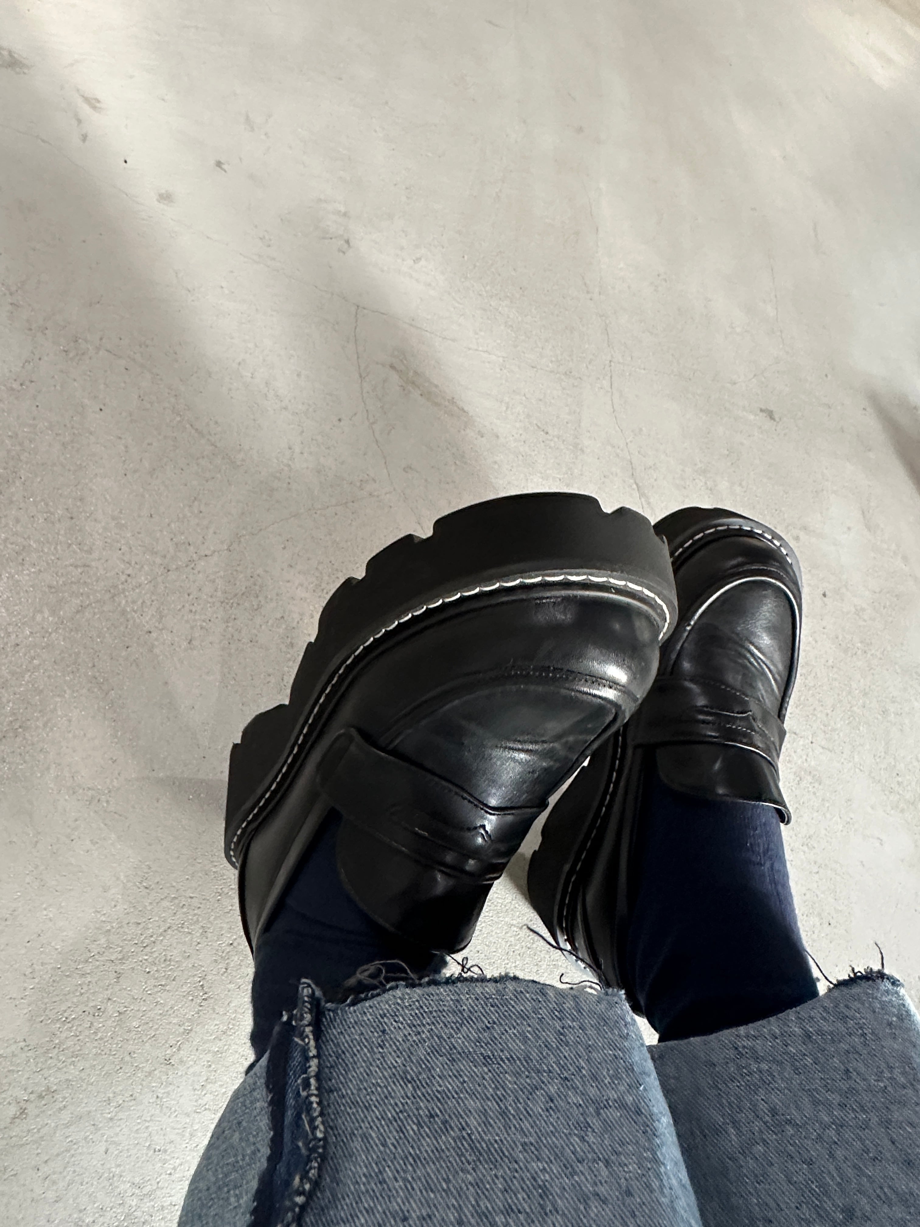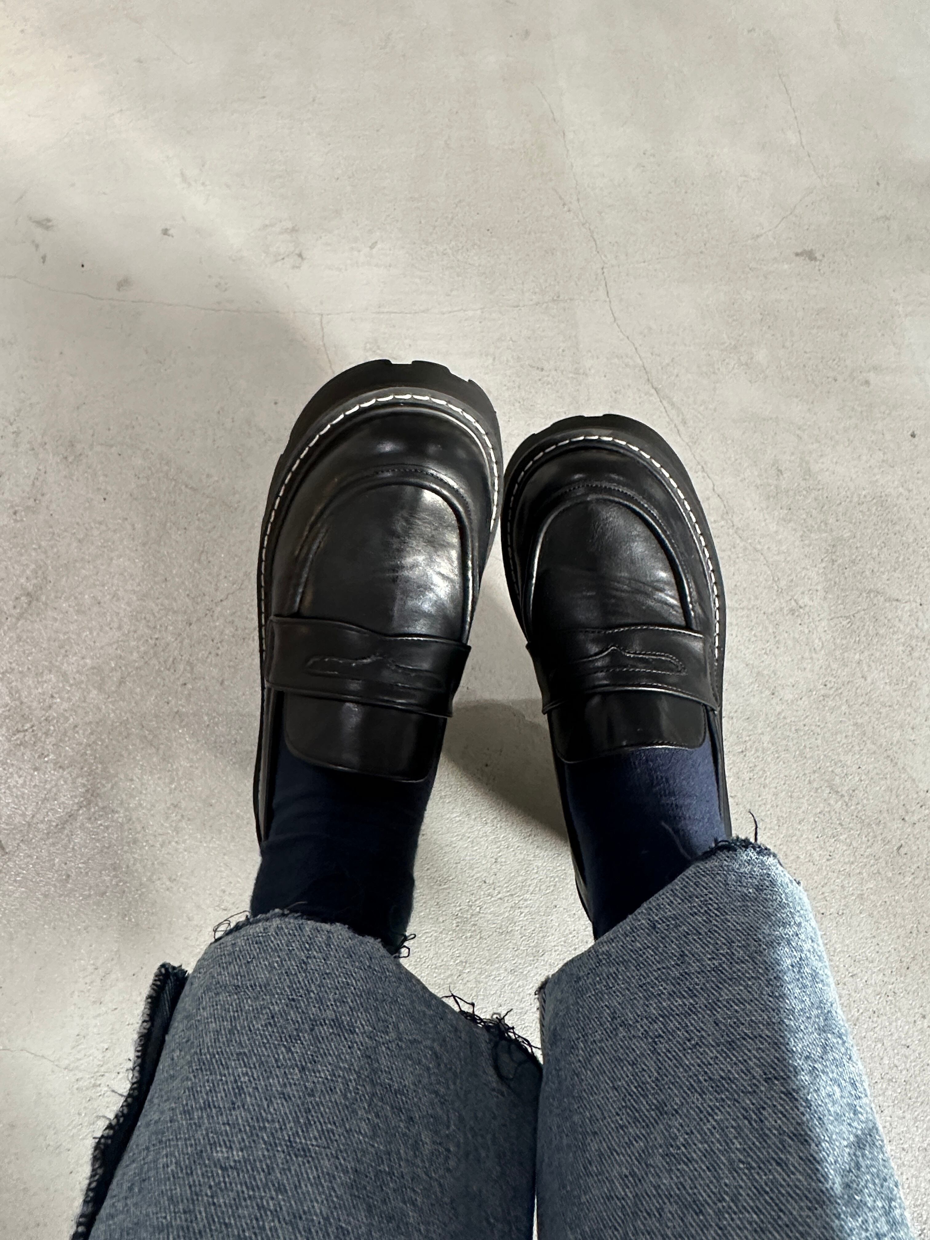 シンプルなデザインでありながら、ステッチや厚底デザインが足元のアクセントとなるローファー。カラーソックやデザインソックスとの相性も抜群です◎