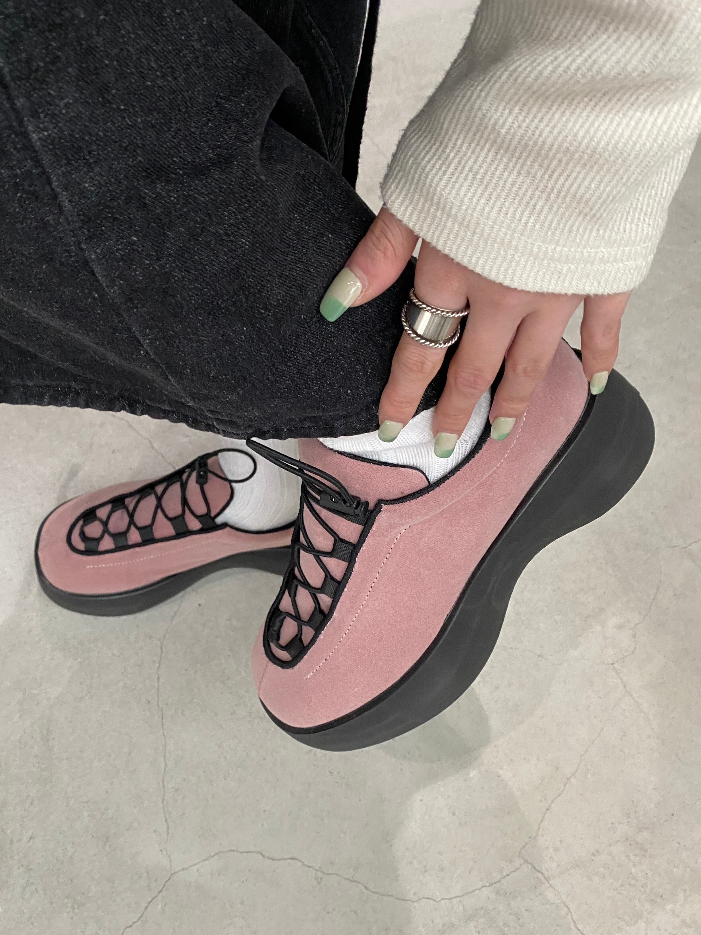 厚底ソールに程よくフェミニンさも兼ね備えたアイテムです。