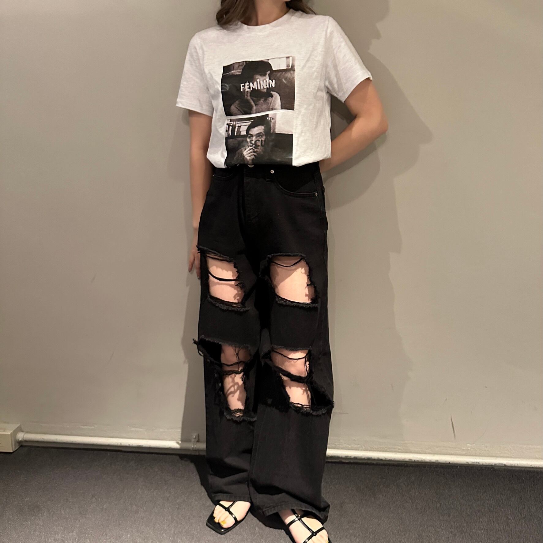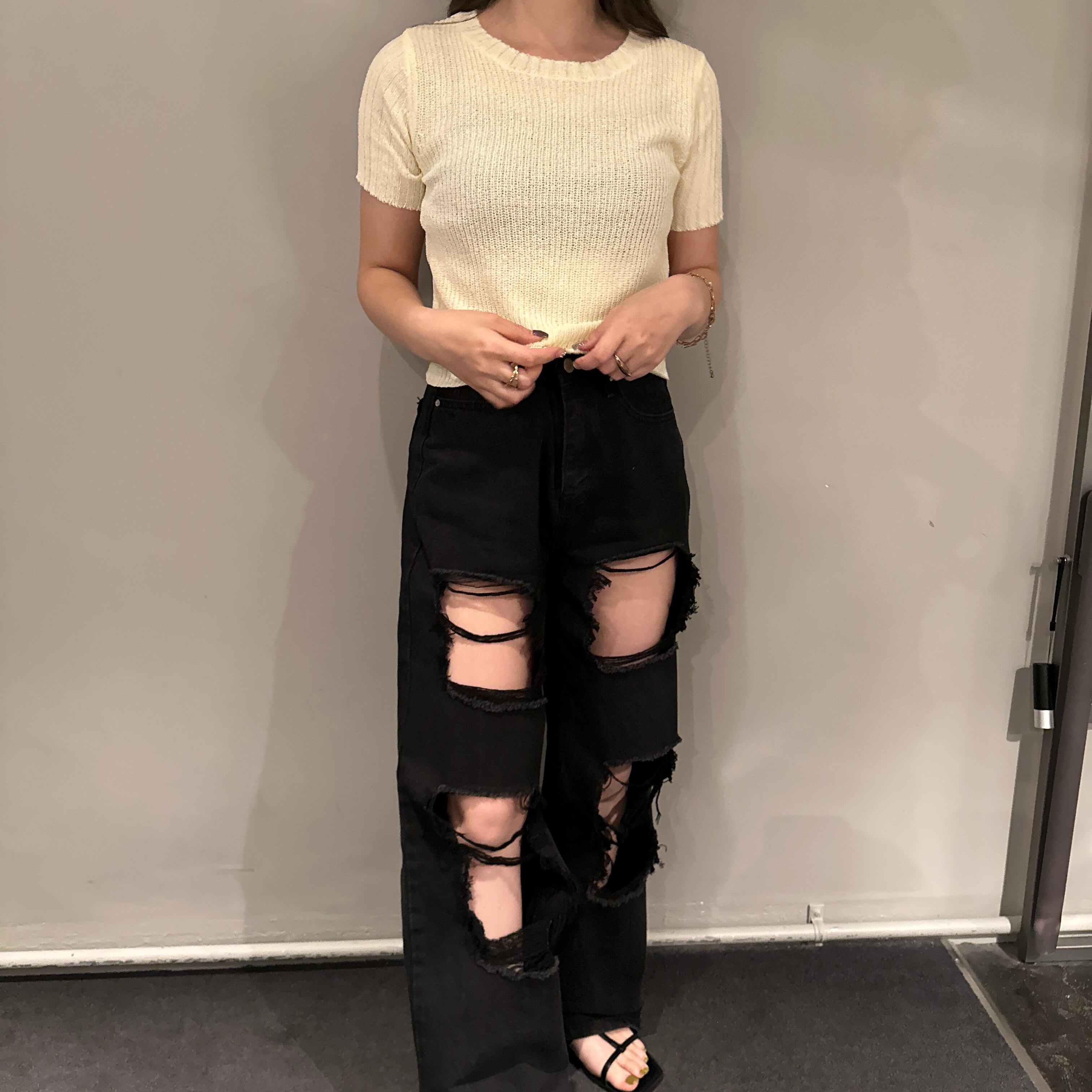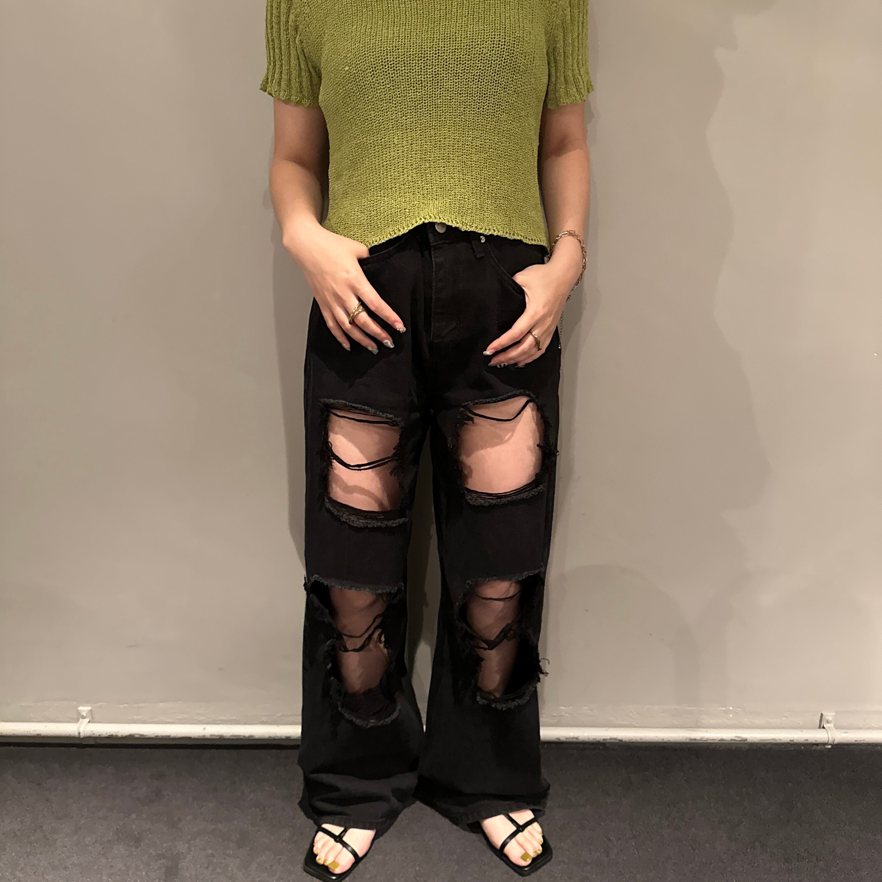 大胆なダメージ加工を施したデニムパンツ。