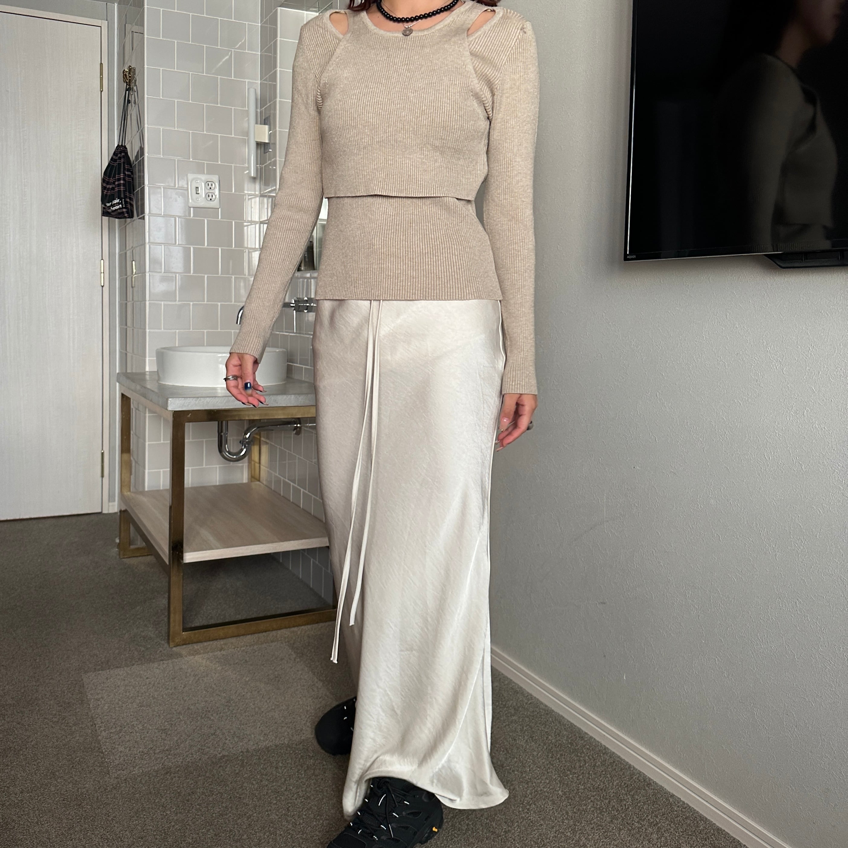 伸縮性のある生地感で程よく体に沿うサイズ感が女性らしさ漂うシルエットに◎